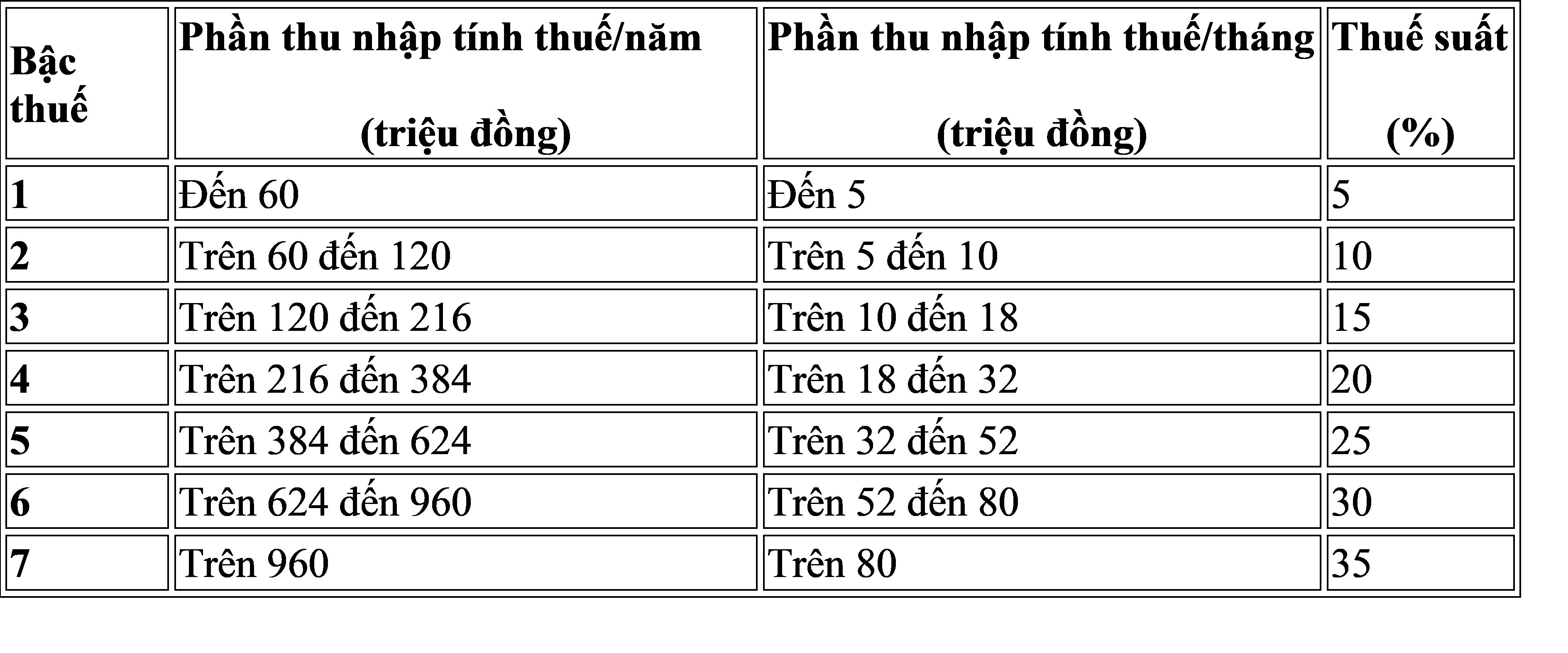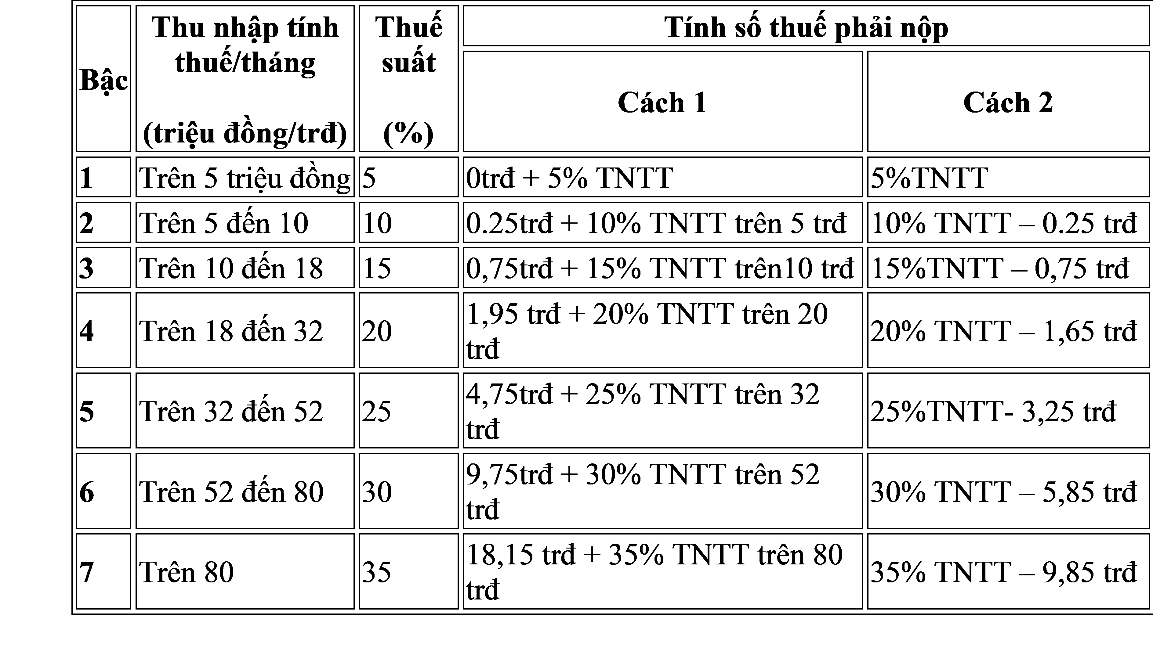 Cách tính thuế thu nhập cá nhân theo biểu lũy tiễn từng phần: Thuế thu nhập cá nhân đối với thu nhập từ tiền lương, tiền công là tổng số thuế tính theo từng bậc thu nhập. Số thuế tính theo tùng bậc thu nhập nhân (X) với thuế suất tương ứng của bậc thu nhập đó;